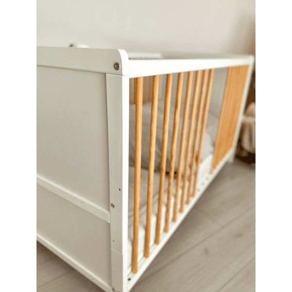 Die freundliche Optik des Bettes schafft eine warme und einladende Atmosphäre im Kinderzimmer. Die sichtbare Holzstruktur und das schlichte Design in Weiß lassen sich mit verschiedenen Dekorationen kombinieren und passen zu jedem Einrichtungsstil. So fühlst du dich wohl und dein Baby erlebt ein harmonisches Umfeld.