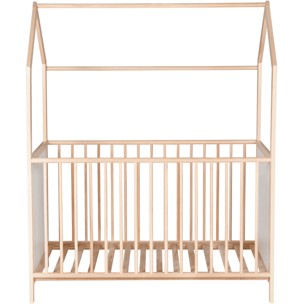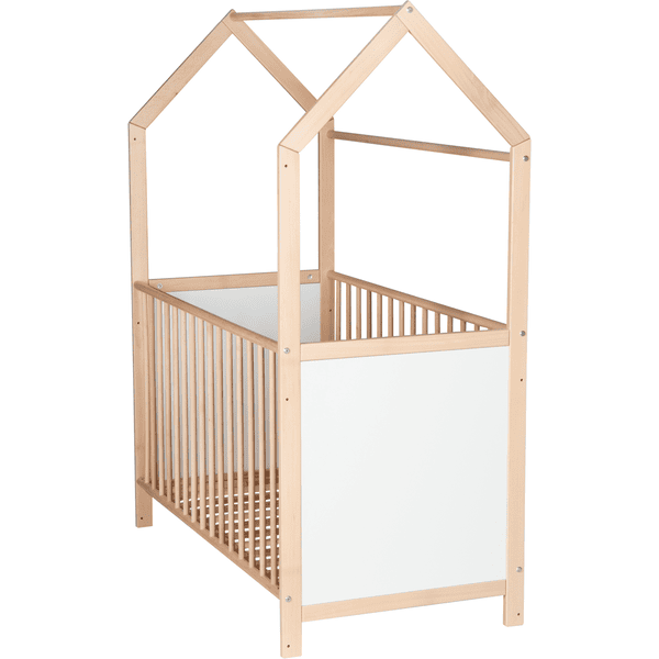 Das Hausbett besteht aus massivem Buchenholz, natur lackiert, und die Seitenteile sind mit weißer Dekorplatte gefüllt. Alle Materialien sind geprüft und schadstofffrei.