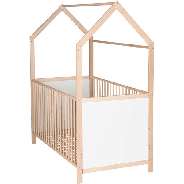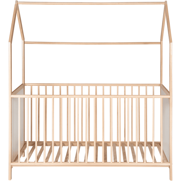 Das Hausbett hat einen naturfarbenen Rahmen mit weiß abgesetzten Seitenteilen, was es zeitlos und vielseitig kombinierbar macht.