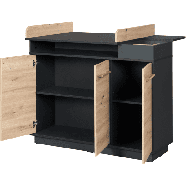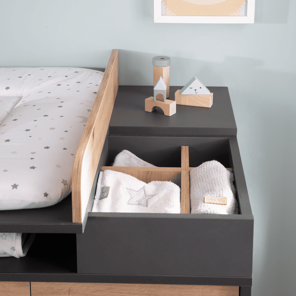 Mit der Kombination aus anthrazitfarbenem Korpus und Türen im Dekor 'Artisan Eiche' setzt die Wickelkommode 'Lenn' stilvolle Akzente in deinem Babyzimmer. Die modernen, massiven Eichenholzgriffe runden das Design harmonisch ab und verleihen dem Raum eine warme und einladende Atmosphäre. So wird das Babyzimmer nicht nur funktional, sondern auch optisch ansprechend gestaltet.