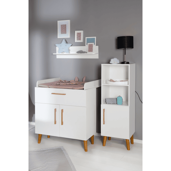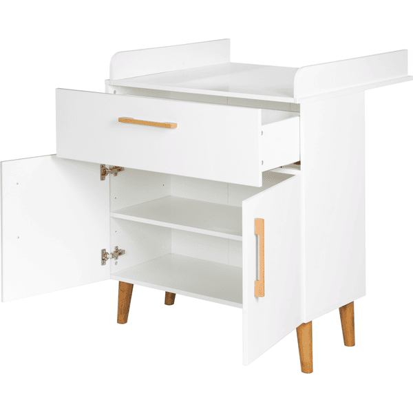 Die Wickelkommode 'Mick' bietet viel Stauraum für Wickelutensilien mit einer Schublade und zwei Türen, sodass alles schnell griffbereit ist.